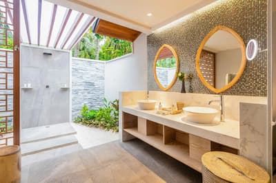 C’est le grand confort ! En bord de mer, elle est confortable et agréable avec sa terrasse aménagée de longues chaises, de fauteuils et d’une piscine. Elle est nichée au milieu de la verdure luxuriante se situant sur la plage et offre un accès direct vers l’océan. Son espace extérieur est luxueux et idéal pour profiter du charme typique des Maldives. Salle de bain semi-ouverte sur un espace verdure avec baignoire à jet et douche.