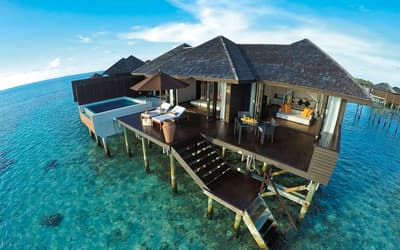 Le top ! Installée en bord de mer, elle est confortable et agréable avec sa terrasse aménagée de longues chaises, de fauteuils et avec son jacuzzi. Elle est nichée au milieu de la verdure luxuriante se situant sur la plage et offre un accès direct vers l’océan. Son espace extérieur est luxueux et idéal pour profiter du charme typique des Maldives. Salle de bain semi-ouverte sur un espace verdure avec baignoire à jet et douche.