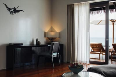 Orientée pour faire face à de merveilleux couchers de soleil, cette suite sur pilotis offre le summum d’une expérience avec les pieds dans l’eau. Son espace extérieur est généreux avec sa piscine et sa terrasse aménagée de longues chaises. Elle profite d'une vue époustouflante sur l’océan Indien et permet un accès direct à l’eau limpide. Grande salle de bain avec baignoire et douche à effet de pluie.