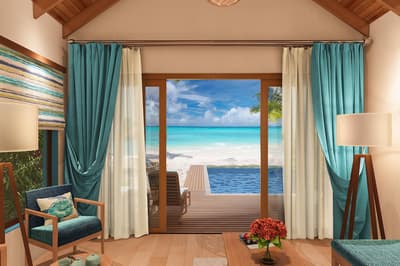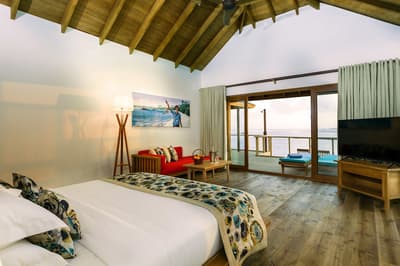 Installée sur pilotis, elle est en première ligne pour une vue époustouflante du lagon turquoise. Elle permet un accès direct à l’eau limpide. Sa terrasse aménagée de longues chaises et d’une table basse est parfaite pour profiter du climat. Petit coin salon avec banquette et un fauteuil. Salle de bain chic avec baignoire contemporaine.