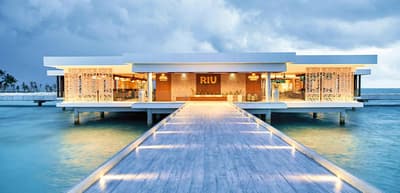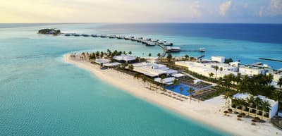 Située au cœur d’un lagon de carte postale, où évoluent des bans de poissons tropicaux que l’on observe à l’œil nu, cette île toute en longueur bordée d’une superbe plage de sable blanc abrite depuis l’été 2019 un hôtel flambant neuf (relié par une passerelle à une île voisine où se trouve un hôtel de luxe du même groupe). Propriété de la chaîne espagnole RIU, ce resort de 264 chambres casse les codes traditionnels des Maldives, proposant des constructions en dur, principalement sur l’île. D’un blanc immaculé, les bâtiments de deux étages accueillent des chambres modernes et lumineuses faisant face au lagon ou à l’océan. Les amateurs de snorkeling s’en donneront à cœur joie, les sportifs également. Ils apprécieront faire du kayak ou du paddle sur une eau turquoise d’une limpidité époustouflante, sans payer de supplément. Car le grand point fort du Riu Atoll est sa formule all-inclusive qui comprend presque tout, sauf la plongée et les soins au spa. Le buffet, fort bien achalandé, ravira les gourmands mais s’il leur venait l’envie de changer de décor et de saveurs, un restaurant italien et un steakhouse, mettant les fruits de mer à l’honneur, font partie de la formule.