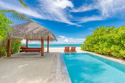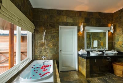 Installée pour faire face aux couchers de soleil, elle profite d’une vue époustouflante sur l’océan. Tout près du lagon, elle permet un accès direct à l’eau limpide. Sa terrasse aménagée de longues chaises et d’un bain à remous est idéale pour apprécier le climat tropical des Maldives. Salle de bain chic fait en pierre avec de belles vasques.
