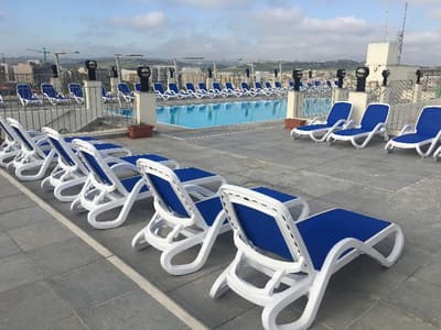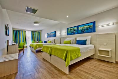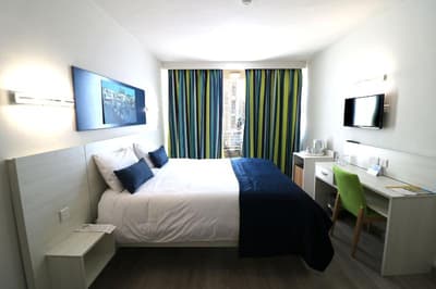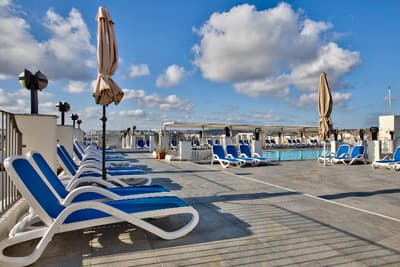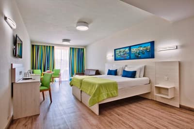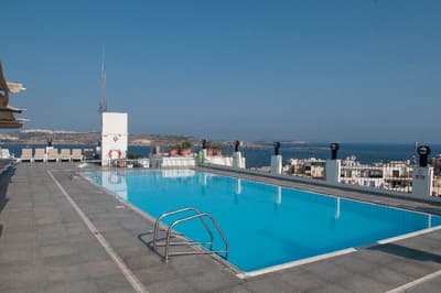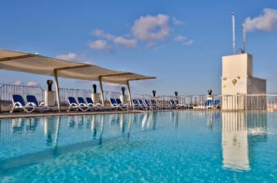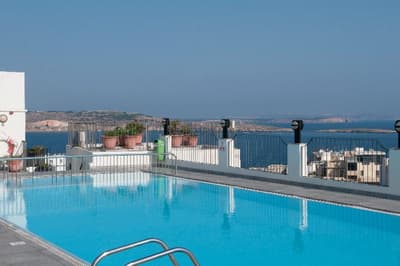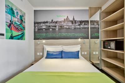 Bienvenue à l’hôtel Santana ! Imaginez un bâtiment moderne de 6 étages qui se dresse en plein dans St. Paul's Bay, une station balnéaire située au Nord de l’île de Malte. À son sommet, un rooftop doté d’une piscine bleutée qui offre une large vue panoramique sur le paysage urbain, la mer et la campagne entourant la baie. Pas mal comme cadre pour taper quelques brasses sous le soleil et se dorer la couenne sur les transats ! 4 étoiles, l’hôtel propose plus de 200 chambres à l’esthétique sobre et moderne avec de belles touches de vert et de bleu vif (la plupart ont un balcon qui donne sur la ville). Le mieux, pour le petit déjeuner, c’est de prendre la formule à volonté. Il y a du choix, et comme ça, vous partirez explorer les alentours le ventre bien rempli. Laissez-vous porter au hasard des rues ou faites appel à la réception pour vous guider dans St. Paul's Bay : la station fourmille de bars, de restaurants, de magasins et d’activités à tester. Il pleut ? Réfugiez-vous donc dans la piscine intérieure chauffée, au sauna, ou dirigez-vers vous vers les soins bien-être et les massages pour un moment relax. À moins que votre truc, ce soit plutôt le sport ? Auquel cas la salle de fitness et ses équipements pour booster le cardio vous tend les bras. Bref, voilà un hôtel qui vous permet de bien profiter du littoral maltais. Et qui est en prime éco-certifié !