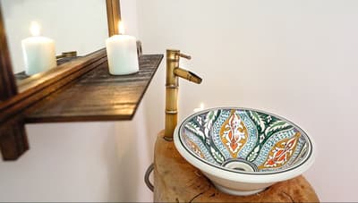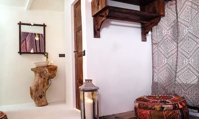 Dans une architecture typiquement marocaine, elle offre une expérience authentique. Elle baigne de couleurs neutres et sobres pour un ensemble harmonieux. Les murs clairs créent une pièce lumineuse. Le mobilier de couleur miel y ajoute une touche d’exotisme.