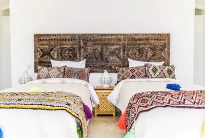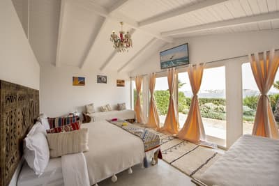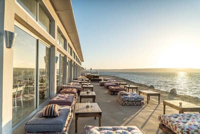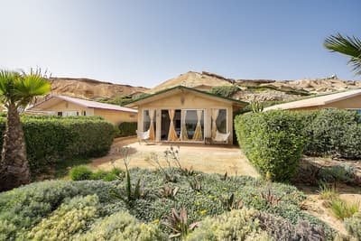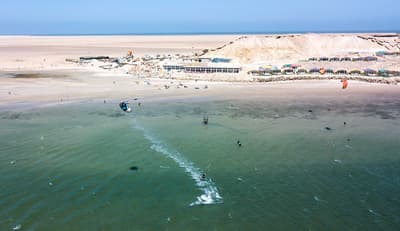 Un point de chute idéal pour les amoureux des grands espaces et des sports nautiques ici au PK25, au bord de la lagune de Dakhla ! La première chose qui interpelle, c’est la palette de couleurs pastel qui se déploie sur les toits des bungalows au pied de cette grande dune. Le tout face à ce lagon aux milles nuances de bleu, de sable et de vert. Et la bonne surprise, c’est qu’on a beau être au milieu du désert, le complexe est vraiment bien végétalisé. Vous aurez votre propre petit jardin avec votre terrasse quand vous serez installés dans votre bungalow. Une vraie petite maison en bois clair spacieuse hyper bien décorée avec des tissus et des meubles marocains canons et colorés. OK, on a presque envie de rester coller ici, mais ça vaut le coup de sortir pour plein de raisons ! Déjà pour le sport center génial pour les kitesurfeurs, surfeurs et autres wakeboardeurs. On peut même faire du kayak ! Mais aussi pour un massage en plein air, une session de bain turc, ou simplement un bon cocktail au bar de la plage. Le soir, on se régale de plats traditionnels marocains. Impossible de se lasser de la bouffe ici : à midi on est sur des plats internationaux, simples mais efficaces, et le matin, le petit-déjeuner à la fois marocain et healthy vaut des points ! Bref, un très bon spot pour des vacances sportives et ressourçantes dans un panorama de fou.