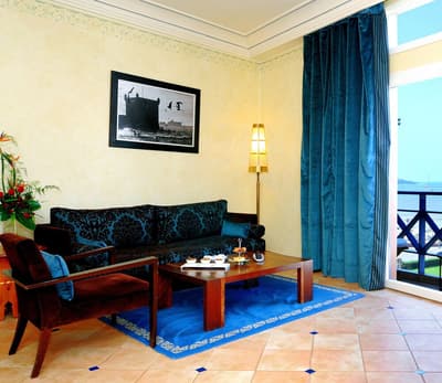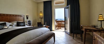 Elle a tout le nécessaire pour un séjour confortable et relaxant. Son balcon complètement aménagé offre une merveilleuse vue sur la Médina étant l’ancienne ville. Elle baigne dans une atmosphère sereine. Coin salon dans la chambre avec un fauteuil et une petite table. Salle de bain avec baignoire.
