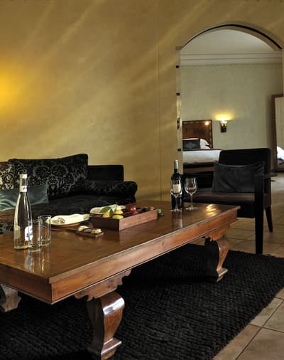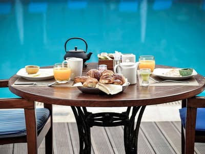 Encore plus spacieuse, cette belle suite offre espace et confort. Elle surplombe la piscine du complexe et profite d'une vue apaisante. Son balcon aménagé de belles chaises en bois est idéal pour apprécier le cadre reposant. Coin salon avec fauteuils et petite table. Salle de bain avec baignoire.