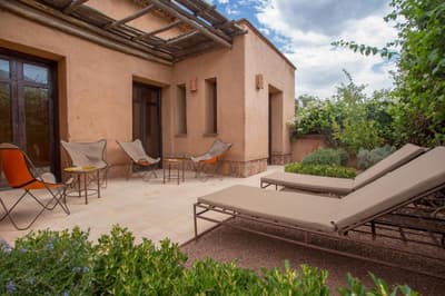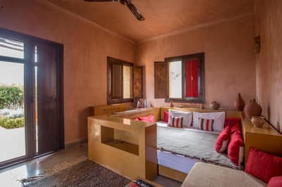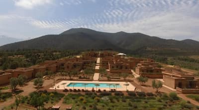 A Tahannaout, sur les premières marches de l'Atlas, à 1200 mètres d'altitude, les Terres d'Amanar vous font savourer la fraîcheur au cœur de l'été. Excellente alternative à Marrakech, cette halte est le combiné idéal pour marier culture et nature ! Dans la journée, elle offre un panorama exceptionnel sur les villages et les sommets. A la nuit tombée, au coin du feu, elle vous fait admirer les étoiles et les lumières de la ville qui scintillent au loin. Juste magique ! Dans ce décor de reliefs contrastés et de terres rouges, vous savourez un thé à l’ombre des amandiers face aux cimes de l’Oukaïmeden, rêvez le temps d’une sieste, ou admirez les chèvres qui paissent tranquillement. A travers cette immersion 100 % nature, votre écolodge vous réénergiser et vous amener à repenser votre vie autour de l'essentiel. A l'image de trois villages, les hébergements sont répartis sur 120 hectares, correspondant chacun à un style de séjour et à un type d’hébergement : les bivouacs, les tentes-lodges et les lodges. Et si les premiers sont spartiates, les deux autres offrent tout du fantasme oriental...