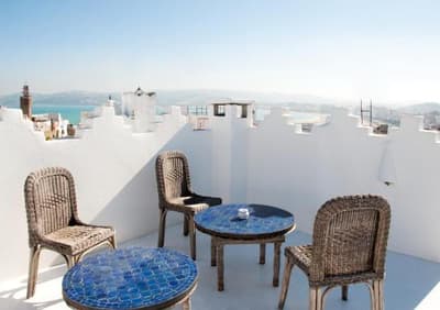 Nour c'est la lumière en arabe. Et quelle lumière! Haut perchée dans le quartier de la Kasbah, cette maison toute en étages et escaliers (effet fitness garanti) est un vrai belvédère dans le ciel de Tanger ! Une fois que vous aurez mis le pied sur ses terrasses, vous allez devenir addict au panorama à 360°, baie de Tanger festonnée par la Méditerranée et cubes blancs de la médina. Dès le petit-déjeuner, vous pourrez repérer vos étapes de la journée en croquant dans les crêpes et beignets parfumés du buffet. Et au crépuscule, vous reprendez des forces avec un mojito- coucher de soleil, l'apéro c'est tous les soirs, pourvu que le climat s'y prête ! S'il pleut, no panic, Dar Nour regorge de petits salons cosy et colorés où s'enfouir dans les coussins après avoir pioché dans la bibliothèque ou la vidéothèque. Les proprios, deux Français amoureux de la ville cultivent l'âme artiste de Tanger, il y a des livres partout : raison de plus pour se poser dans le confort des chambres et suites, et capter sur son smartphone quelques détails déco, verre de Venise ou carreaux de céramique andalous. De quoi vous donner envie de chiner à votre tour, la maison regorge de bonnes adresses pour vivre Tanger like a local, il suffit de demander ! Boutiques design, galeries ou librairies, cafés dans leur jus ou petits restos retro, on n'oublie pas de goûter la cuisine maison, à Dar Nour ou dans son salon de thé tout bleu place de la Kasbah : on y croque la Méditerranée avec les yeux et dans l'assiette où frétillent les saveurs incomparables de la pêche du jour !