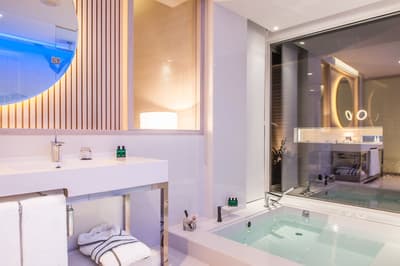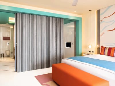 L’intérieur arbore un design signé Galal Mahmoud et de la lumière naturelle. La chambre est dotée d'un lit King confortable MyBed, un beau sol et une banquette. La salle de bains spacieuse est dotée d’une grande baignoire, d’une douche et d’un double vasque. Le tout dans une ambiance tropicale et farniente !