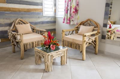 C’est un petit cocon ! Nichée parmi la végétation luxuriante, elle baigne dans une atmosphère sereine. Elle accommode un grand lit et le coin salon est meublé de beaux fauteuils. Salle de bain chic.