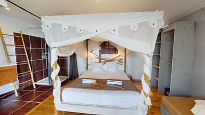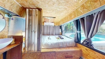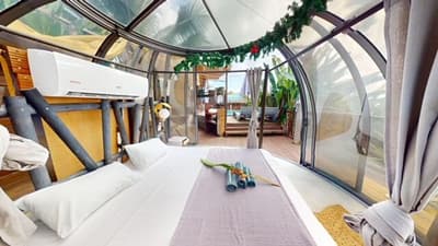 Ça vous dit, un concept d’écolodge dans un jardin tropical face à la mer dans le sud de la Martinique ? Alors Dom Nature Lodge pourrait bien vous taper dans l’œil. Sa position à seulement quelques mètres de la mer est THE point fort du domaine : les eaux turquoise des Caraïbes brillent devant vos yeux et le fameux Rocher de Diamant – petite île sauvage qui compte parmi les plus beaux spots de plongée de toute la Martinique – se dresse fièrement à l’horizon. Mais l’endroit a bien sûr d’autres atouts dans sa manche. On aime bien les différents logements éco-responsables, tous bordés de palmiers et de bananiers, imaginés par Leslie et Fabien, les proprios des lieux. Ça fait très récup’ et en même temps, c’est cosy. Vous préférez le dôme transparent pour des nuits en duo à regarder les étoiles (avec piscine privée), le bus scolaire réhabilité pour les familles, ou le bungalow avec toit panoramique pour roupiller à la belle étoile ? Ils sont dans tous les cas composés de matériaux naturels et munis de toilettes sèches. Après une bonne nuit dans un confortable lit queen-size, régalez vous avec le petit déjeuner, qui comprend d’excellentes confitures et des jus exotiques. Il ne reste plus qu’à filer du côté du SPA pour digérer tout ça. À moins que vous ne soyez d’humeur à explorer les environs, auquel cas vous pouvez louer des vélos et des scooters pour une balade autour de Sainte Luce ou bien emprunter un canoë ou un paddle pour glisser au bord de la mangrove endémique du sud. Y a même des scooters marins pour aller faire coucou aux poissons !