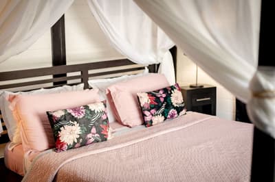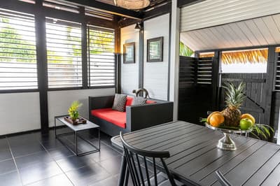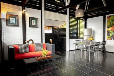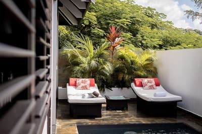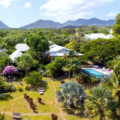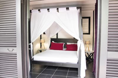 Qui est chaud pour une retraite chic dans un coin très vert de la Martinique ? Bienvenue au Domaine La Palmeraie, un endroit calme et intime perché sur les hauteurs au sud de l’île. Le Domaine se trouve en fait dans un jardin de 7200 m², où se côtoient hauts palmiers, bougainvilliers aux éclatantes fleurs fuchsia et arbres tropicaux à gogo. Autant dire qu’on est complètement immergés dans la flore exubérante de celle qu’on surnomme à juste titre l’île aux Fleurs ! Les sept villas proposées, dont la disposition confère une grande intimité, ouvrent sur ce paysage calme et dépaysant. En plus, leur design change de ce qu’on a l’habitude de voir : ici, le style caribéen se mêle au design zen asiatique, et l’intérieur se coule dans une ambiance chic et moderne entre gris, blanc et noir, avec quelques jolis petits clins d’œil décoratifs à la flore locale. Original, non ? On apprécie aussi les dimensions assez dingues des villas, de 100 m² à 160 m² pour deux personnes. Vos valises posées, allez donc taper quelques brasses dans votre piscine privée, avant de faire bronzette sur le transat en terrasse en écoutant le doux bruit des palmiers. Et si la nage vous a creusé la panse, direction la cuisine pour préparer un bon petit plat – ou faire appel au service traiteur du Domaine, à base de cuisine créole. Il ne vous reste plus qu’à vous tourner vers la réception pour réserver une sortie autour de la commune de Diamant. Amateur de plongée ? Notez qu’un des beaux plus beaux des spots de l’île n’est qu’à quelques kilomètres de là.