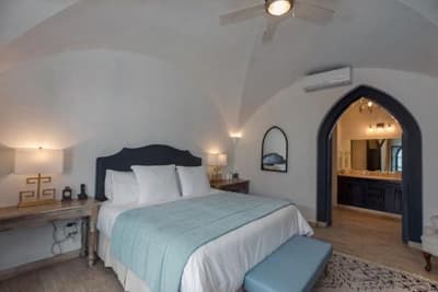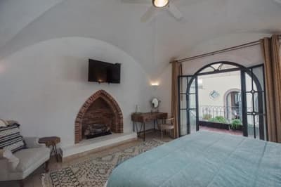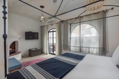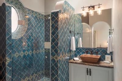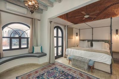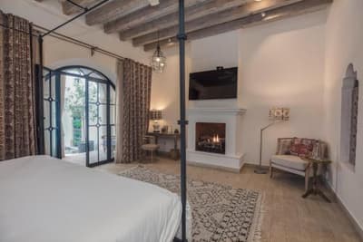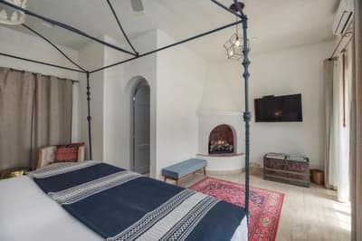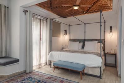 Bleu ! C'est la couleur matrice de ce boutique-hôtel et maison d'hôtes. La porte d'entrée tout en bois, superbement décorée est d'un bleu qui claque, entre le turquoise et le bleu électrique. Un patio s'ouvre alors devant vous, avec la fontaine traditionnelle et les pots de fleurs qui s'étagent sur les murs, comme si vous étiez en Andalousie. Une large porte-fenêtre à miroirs donne une belle profondeur. Le fer forgé domine aux balcons ainsi que sur la rambarde de l'escalier qui grimpe jusqu'au deuxième étage, sur les toits. A l'intérieur, les bleus marine et canard s'invitent sur les murs et sur les sofas capitonnés. Des consoles et tables en laiton campent sur des tapis à motifs géométriques, formidablement colorés. Ces plafonds en briques ou voûtés sont juste incroyables ! Ces poutres patinées apportent un cachet fou. Les commodes et coiffeuses XIXème cohabitent harmonieusement avec les fauteuils design. Arcs en plein cintre, arcs brisés, occuli et mousharabieh rythment les différentes ouvertures de la maison. Depuis la Roof Garden Suite, vous vous délecterez de ce soleil couchant enflammant les flèches roses de La Parroquia. Une casa et une ville fascinante que votre hôte saura vous faire aimer...