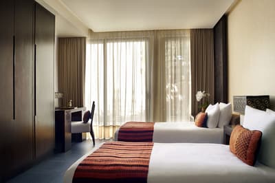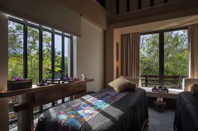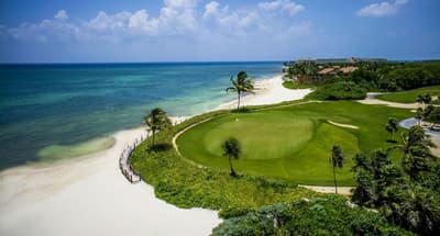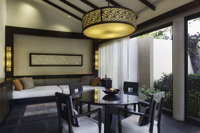 Spacieuse et confortable, elle accommode toute la famille dans son ensemble conviviale tout en étant luxueuse et chic. Elle dispose de 2 chambres, d’un vrai salon et d’une piscine privée profitant d’une vue magnifique sur le parcours de golf. C’est une suite ouverte procurant une sensation d’espace. Baignoire extérieure très exotique.