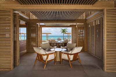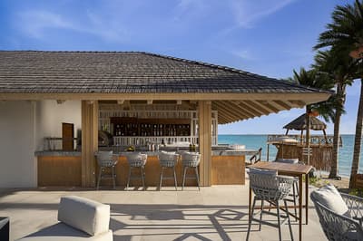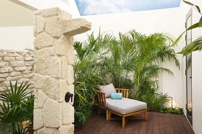 Un sanctuaire paisible et propice à la détente. Elle profite d'une vue panoramique sur la mer des Caraïbes. Son balcon aménagé offre une piscine privée pour une expérience luxueuse du front de mer. Dispose de 2 lits Queen size et d'une petite table et de chaises en bois dans un coin de la chambre. C’est une pièce ouverte procurant une sensation d’espace. Baignoire extérieur exotique.