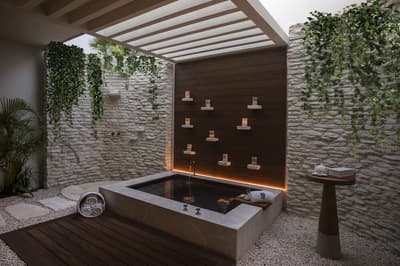 C’est un mélange de style asiatique luxueux au charme mexicain local. Elle est en parfaite harmonie avec son environnement naturel. Son carrelage de couleur sombre contraste avec les murs clairs de la pièce.