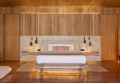 C’est un mélange de style asiatique luxueux au charme mexicain local. Elle est en parfaite harmonie avec son environnement naturel. Son mobilier en bois de couleur miel lui donne un style exotique. Elle est chic tout en étant cosy avec ses petites lampes de chaque côté du lit.