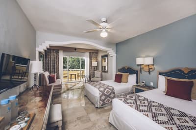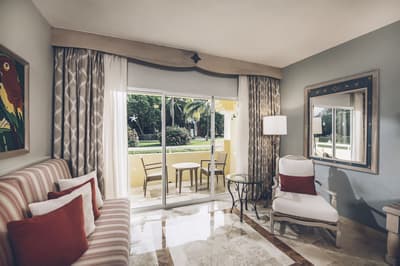 Cette suite profite d’un accès direct à la plage et offre une vue magnifique sur le front de mer. Agréable et confortable, elle baigne dans une atmosphère reposante. Elle dispose d’un balcon ou d’une terrasse aménagée d’une petite table et de 2 chaises. Coin salon avec une banquette, table basse et fauteuils. Elle peut accueillir un lit King ou 2 lits doubles. Grande salle de bain chic.