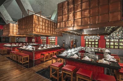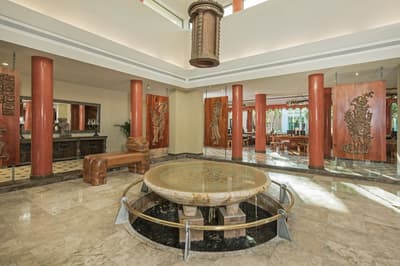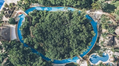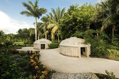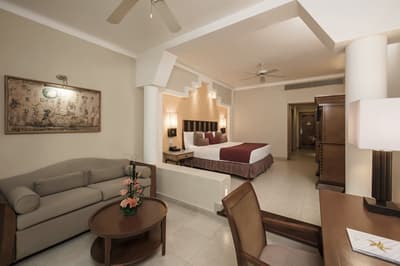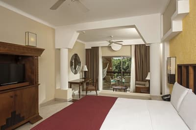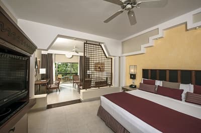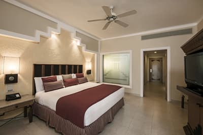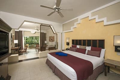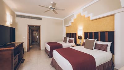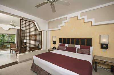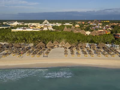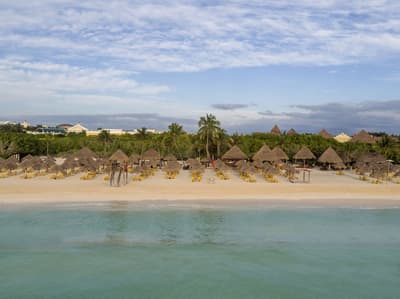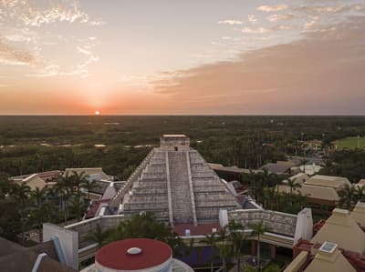 Vu du ciel, la beauté du site claque ! Mer turquoise, sable blanc et jungle étendue, la carte postale est là ! Un cercle bleu, immense, émerge immédiatement du site… C'est la "rivière" que le resort s'est dessiné pour rappeler les nombreuses lagunes qui peuplent la région. Autre clin d'œil à dame Nature: ces toits de palapas qui viennent typer l'architecture, à côté d'un bâtiment néo-colonial plus solennel. Et puis il y a cette incroyable pyramide voulant imiter celle de Chichén Itzá, qui s'élève d'entrée, au-dessus du hall ! A l'intérieur, l'empire Maya décline tous ses codes : glyphes monumentaux, jaguars et animaux fantastiques, fontaines, roues calendaires, etc. Bref, vous êtes bien au Mexique, avec en plus quelques clichés contemporains, comme le restaurant El Tapatio, vitrine caractéristique d'une "cantina" locale, avec ses couleurs et son cadre rustique. Changement radical de décor au restaurant L'étoile ! Pour évoquer la France, les lustres en cristal, le velours rouge, la passementerie, les moulures dorées et surtout les tableaux de Toulouse-Lautrec peints sur tout le pourtour de la salle, donnent le change. Et vous pourrez multipliez les ambiances à l'infini avec l'accessibilité à tous les autres hôtels Iberostar alentours...