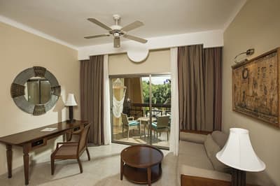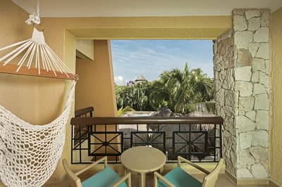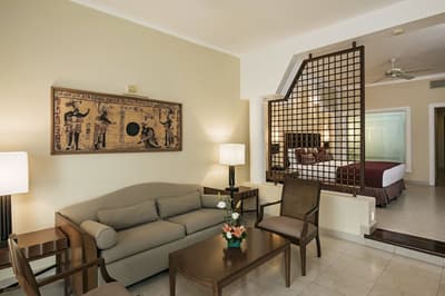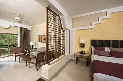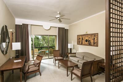 Confortable et agréable, elle dispose d’un petit salon en chambre avec fauteuils et table basse. Située à proximité de la piscine et de la plage, elle y offre un accès facile avec une vue apaisante sur le jardin de l’hôtel. Son balcon est aménagé de chaises et d’une table. Elle peut accueillir un lit King ou 2 lits doubles. Grande salle de bain chic avec baignoire d’hydromassage.