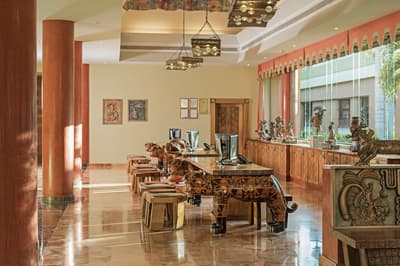 Elle mélange des éléments traditionnels à l’ensemble plus moderne tels qu’un beau tableau avec des illustrations maya et des détails plus subtils comme quelques couleurs au mur. De belles lampes ajoutent de l’élégance à la pièce. Le mobilier en bois de couleur caramel rend l’ensemble très design.