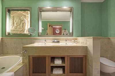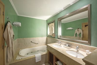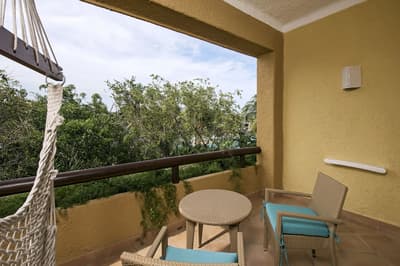 Située à proximité de la piscine et de la plage, elle y offre un accès facile avec une vue apaisante sur le jardin de l’hôtel. Son balcon est aménagé de chaises et d’une table. Petit coin salon en chambre avec fauteuils et table basse. Elle peut accueillir un lit King ou 2 lits doubles. Grande salle de bain chic avec baignoire d’hydromassage.