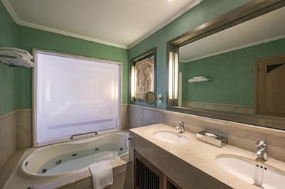 Elle profite d’une belle vue sur le jardin de l’hôtel. Dispose d’un balcon aménagé de chaises et d’une table. Petit coin salon en chambre avec fauteuils et table basse. Elle peut accueillir un lit King ou 2 lits doubles. Grande salle de bain chic avec baignoire d’hydromassage.