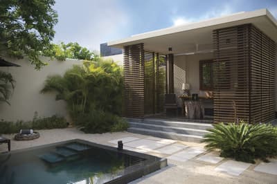 A l'origine, le Nizuc Resort & Spa était une résidence présidentielle. Alors autant vous dire que le site a été choisi scrupuleusement ! 12 hectares d'une nature splendide, et la beauté des bâtiments venus grossir le noyau principal détonne avec les usines à touristes de la baie de Cancun... Côté look, on est sur un design contemporain, mais un design durable ! Le bois domine, merveilleusement rehaussé par les couleurs de la végétation indigène : jacinthes d'eau, raisiniers, cassiers, palmiers... L'eau accapare tous les points de vue, avec des bassins sublimes, tapissés d'ardoise. A la nuit tombée, les illuminations vous donnent l'impression de pénétrer dans un sanctuaire, surtout avec cette vasque monumentale qu'on fait flamber... Les intérieurs aussi la jouent naturelle, avec des juxtapositions de bois aux couleurs et aux formes différentes. On craque pour les aménagements du Punta Grill & Lounge, hérissé de cloisons à l'asiatique, avec ses planchers, ses persiennes... On dirait que tout a été sculpté dans le bois. C'est prodigieux ! On aime aussi les salons, super cosy, avec leur sol en damier noir et blanc et leur mobilier tout cuir. Mais le top, c'est encore l'immense terrasse du Terra Nostra...