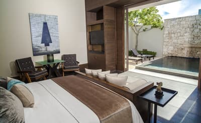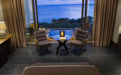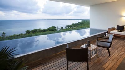 Spacieuse, pouvant être située du premier au cinquième niveau de la zone de résidence, elle dispose de fenêtres, allant du sol au plafond, qui s’ouvrent sur une belle terrasse accueillante. Elle est dotée d’une piscine à débordement et offre des vues panoramiques sur l’océan. À noter qu’elle est reliée de manière pratique à l’Ocean View Deluxe Double.