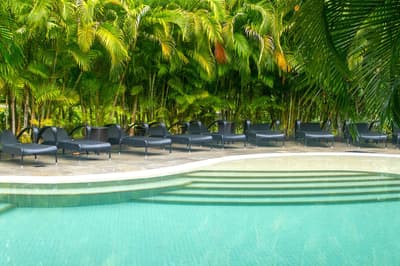 Plus spacieuse, elle se situe sur deux niveaux et comprend une grande terrasse avec hamac et chaises longues d'où vous pourrez profiter de la vue imprenable sur les magnifiques jardins de l'hôtel.