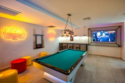 Située à proximité de la piscine, elle y offre un accès facile et une vue relaxante. Sa grande baie vitrée procure une sensation d’ouverture et d’espace. Une table de chevet avec une magnifique lampe est installée entre les deux lits doubles. Petit coin salon dans la pièce avec fauteuil et table basse. Grande salle de bain chic.