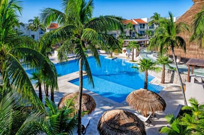 Un petit hôtel au cœur de jardins tropicaux le long d'une belle plage de sable blanc, avec une grande piscine avec vue sur la mer, au sud de Playa del Carmen