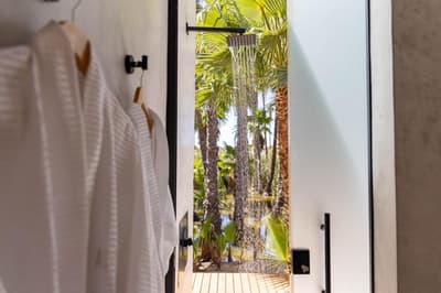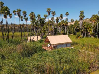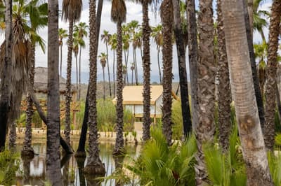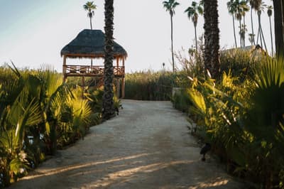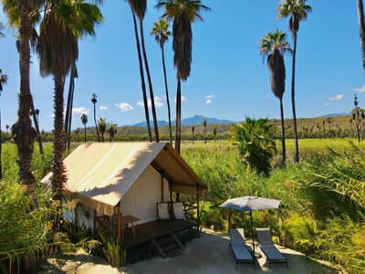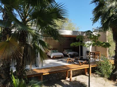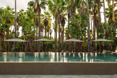 A Colonia La Laguna, au nord de Santiago, l'Amet Nature Retreat propose une alternative singulière aux grands resorts de Los Cabos. La sublime palmeraie qui émerge du décor de lagune éblouissant dans lequel il s'est invité, se dresse comme autant de totems sur un site sacré. D'ailleurs, on parle davantage d'un sanctuaire que d'un hôtel. La faune s'y réfugie volontiers, pour votre plus grand bonheur... Aigles, faucons, oies, hérons blancs et gris, canards et grenouilles comptent parmi ses habitants. Seule la piscine à débordement réussit à rivaliser avec la beauté de cet immense plan d'eau où se reflète le ciel étoilé à la nuit tombée. Les chambres, au nombre de six, se font discrètes. Et pourtant, que ce soient les tentes de luxe, dignes d'un safari, ou les suites en dur au design épuré, chacune occupe un poste stratégique pour capter toutes les perspectives offertes par ce paysage surréaliste. Vos journées ici pourraient se limiter à la contemplation, mais le yoga, la méditation en mouvements et la danse extatique auront toute leur place dans votre agenda. Le Spa est lui aussi de mèche, profitant de cet environnement ressourçant pour optimiser les bienfaits des soins qu'il vous recommande. En cuisine, le chef fait de même, utilisant exclusivement des produits locaux pour coller à ce concept d'harmonie totale. Aux alentours, sentiers de randonnées, sources chaudes et cascades prologeront ce sentiment de fusion...
