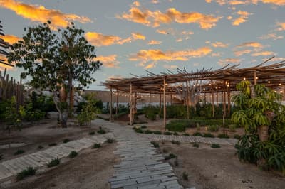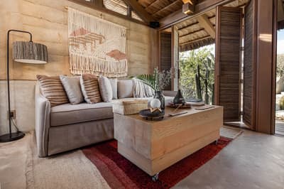 On aime beaucoup leur devise : "Perdez-vous d'abord pour mieux vous trouver ensuite !". Et vous perdre dans ce merveilleux oasis entre désert en océan, à 800 mètres d'une plage magnifique, c'est tout le "mal" qu'on vous souhaite ! Du jardin aux bungalows, en passant par la piscine, le resto et l'observatoire, ce sanctuaire façon "Out of Africa" offre non seulement des perspectives inattendues, mais aussi une sérénité sans pareille. Ici, chaque lieu, chaque objet a une vocation : vous permettre de respirer, de réfléchir et de gagner en clarté. Les chambres, à l'accent rustique-chic, faites de pierre, de bois et d'argile, ont quasi des pouvoirs sensoriels ! On craque pour leur design et celui du mobilier, ainsi que pour ce délicieux hamac en terrasse. Les pièces de textiles et les luminaires sont sublimes ! La piscine à débordement est splendide et le jacuzzi... rouge, profond, comme un cenote, est encore meilleur de nuit, sous les étoiles. Tout autour, les daybeds sont aussi confortables que votre lit ! Et si le resto propose une cuisine irréprochable, les pique-niques sur la plage, préparés par le chef, ne sont pas moins irrésistibles et leur version nocturne autour d'un feu, juste mémorable ! On adore en tout cas l'archi du Coyote, comme une paillotte de plage éphémère. En matière d'architecture d'ailleurs, El Perdido Desert Dream l'a jouée 100 % authentique en respect de la tradition et de l'environnement qu'il chouchoute. Traitement des eaux, économies d'énergie et lutte contre le gaspillage alimentaire sont parmi ses priorités.