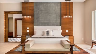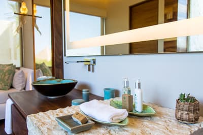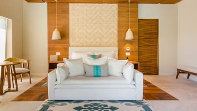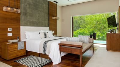 Elle s’intègre parfaitement au paysage. Dominée de blanc, elle est très lumineuse. La pièce est meublée avec des matériaux nobles la rendant chic et encore plus élégante. La décoration rend hommage à la civilisation maya avec les couleurs et les matériaux locaux utilisés. Avec ses lampes en osier de chaque côté du lit, la pièce est en complète harmonie.