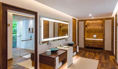 Installer au premier étage, elle est environnée de magnifiques jardins luxuriants. Elle procure intimité tout en donnant la possibilité de la connecter avec d’autres villas. Elle offre un ensemble luxueux avec sa piscine privée tout en étant cosy. Salle de bain en verre et en bois avec une douche à effet de pluie très exotique entourée par la végétation. C’est une oasis au milieu de la jungle.
