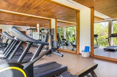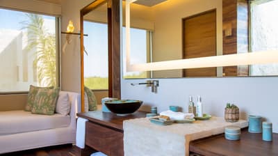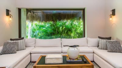 C’est le grand confort ! Conçue sur 2 étages, elle offre 3 villas en une avec ses 3 chambres indépendantes. Avec une piscine privée sur les deux étages, c’est du luxe dans un environnement très exclusif. Salles de bains en verre et en bois avec douche à effet de pluie très exotique entourée par la végétation. Elle est une oasis au milieu de la jungle.
