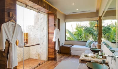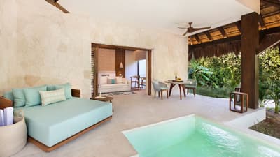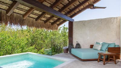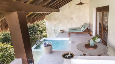 Pas de buffet, pas d’animation, pas de sensation typique… Bref, aucun des clichés classiques d’un resort ne répond présent à l’appel. Bien essayé ! Ici, c’est plutôt le strict minimum qu’on vous propose… et avant de vous énerver, sachez une chose : c’est vraiment tant mieux !! Toutes les qualités d’un resort sans les inconvénients, vous allez vous plaindre de quoi ? Après, tout dépend de votre point de vue, mais si vous cherchez du calme et de la détente, vous n’auriez pas pu tomber sur mieux. Avec son aspect moderne et naturel à la fois, le Chablé Maroma prend le meilleur des deux pour vous offrir un mélange parfait ! Où que vous regardiez, il y aura quelque part pour faire trempette : des piscines, des jacuzzis, jusqu’à la plage privée qui n’attend que vous ! Même dans les villas (pas de chambres ici, que des villas !), vous aurez votre propre mini piscine rien qu'à vous. Intimiste à souhait ! Et si vous voulez encore plus qu’on vous foute la paix, vous pouvez prendre une Stand Alone Villa, plus recluse, à l'écart de tout le monde. On vous propose un défi : après votre séjour, essayez de le décrire en un seul et unique mot, on parie déjà cinquante euros que ce sera « paradisiaque » !