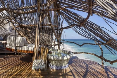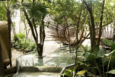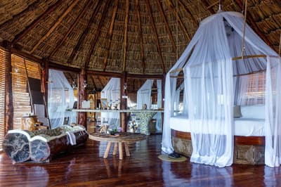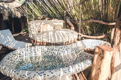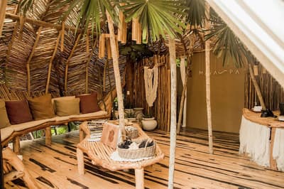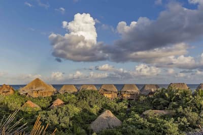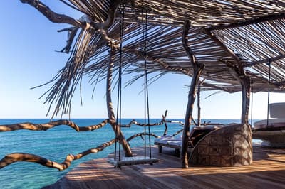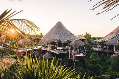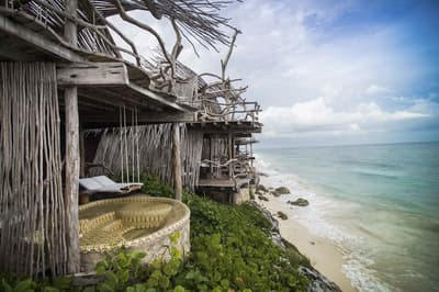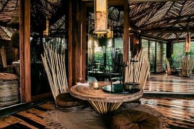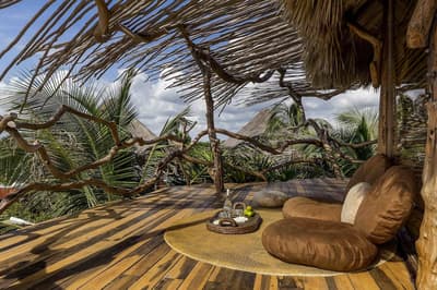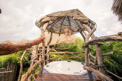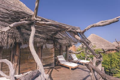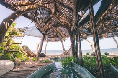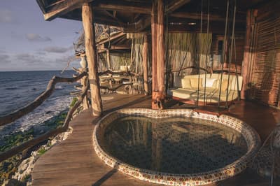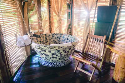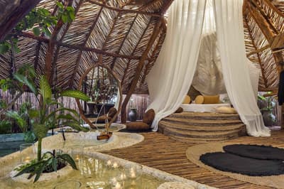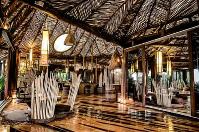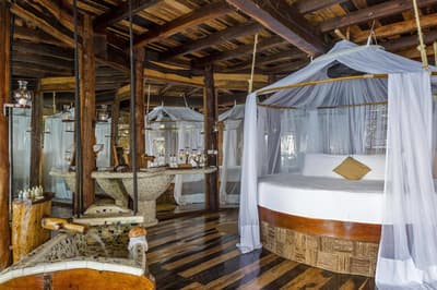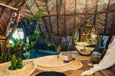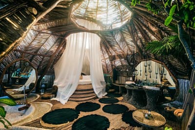 Ce délire d'architecte pourrait bien être le vôtre ! On dirait que la jungle a créé tout ça elle-même. Il n'empêche que tout a été construit à la main et c'est carrément prodigieux ! Il y a un côté Waterworld si vous vous souvenez de ce film, un côté nids aussi, perchés à 12 mètres, que des passerelles en bois relient les uns aux autres. Ces dernières courent d'ailleurs le long d'une falaise, pour descendre ensuite à pic jusqu'à la plage. Parler de Crusoé ici n'est pas seulement une formule, car l'esprit roots ne concerne pas uniquement les racines de ces milliers d'arbres qui cloîtrent ce paradis de nature, mais bel et bien un style de vie. Si les villas sont de sublimes sculptures habitables, elles n'ont pas vocation non plus à vous retenir à l'intérieur si ce n'est pour dormir évidemment ou profiter de votre jacuzzi panoramique. Celui de la Moon Villa est d'ailleurs fantastique ! Et comme son nom l'indique, les jeunes mariés y trouveront un cadre idyllique pour faire provision de souvenirs insolites. Cet écolodge est avant tout un concept pour vous permettre de faire corps avec cette vie végétale et minérale omniprésente, et avec une culture amérindienne forte...