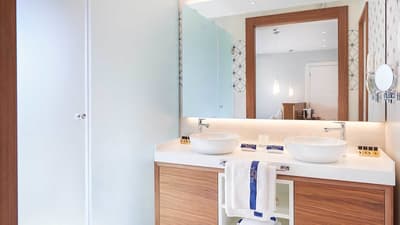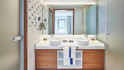 La vue est superbe ! De son balcon complètement aménagé, elle profite d’une vue merveilleuse sur l'océan turquoise. Elle accommode un grand lit et dispose d’un bureau. Le salon est meublé de beaux fauteuils et d’un canapé. Salle de bain avec douche à effet de pluie.