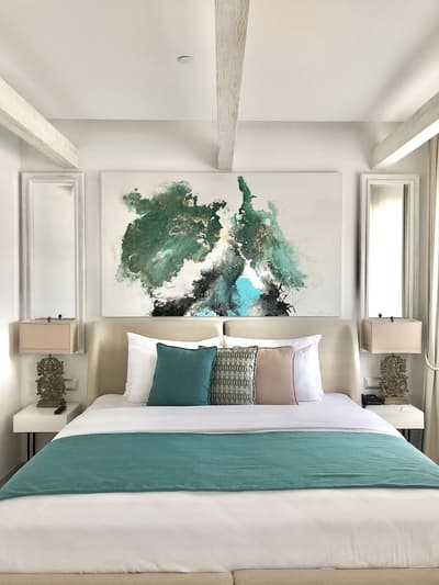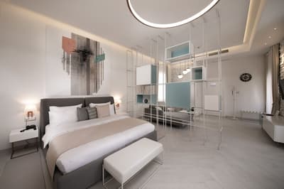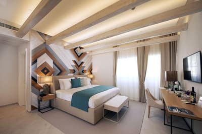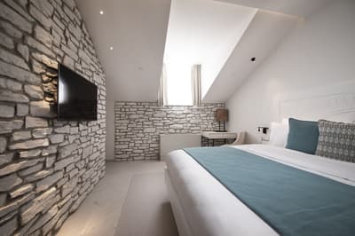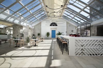 Quelle élégante demeure ! Ce bâtiment, qui date de 1732, a été rénové avec soin pour devenir le Lazure Hotel & Marina. La façade, vêtue de pierres et parée de volets blancs, avec un unique balcon central, vous fera voyager dans le temps. Mais surtout, vous serez empreint d’un sentiment de sérénité dès l’arrivée. En flânant sur la promenade au bord de la marina, avec ses bancs qui invitent à un moment de réflexion, et sous les pins centenaires… vous découvrirez le plaisir de vivre au rythme méditerranéen ! À l’intérieur, tout a été pensé pour souligner le charme de l’ancien. Les tonalités de gris et de beige, de turquoise et de rose pâle, avec quelques jets de couleurs vives dans les tableaux contemporains, confortent les lignes épurées des chambres. Les luminaires modernes et la robinetterie cuivrée de la salle de bain contrastent joliment avec le mur de pierre apparent. Les espaces sont à la fois intimes et ouverts, avec une séparation aérée ou une baignoire placée près du lit king size. La lumière naturelle sublime l’ensemble au travers des voilages et des grandes baies vitrées, mais aussi de l’atrium du lounge bar. Prenez garde si vous voyagez avec votre moitié, car ce lieu fait bien souvent l’effet d’un « on reviendra pour se marier » !