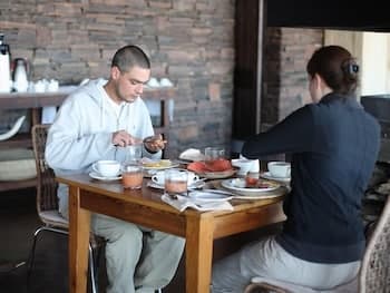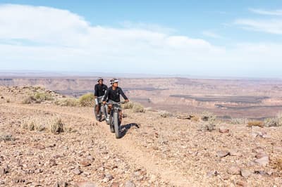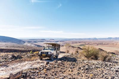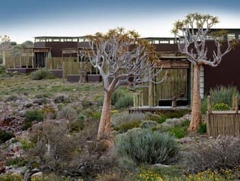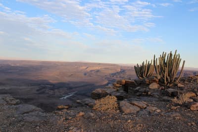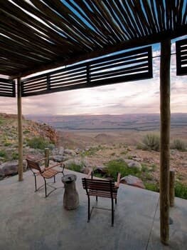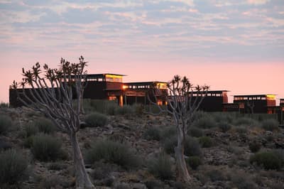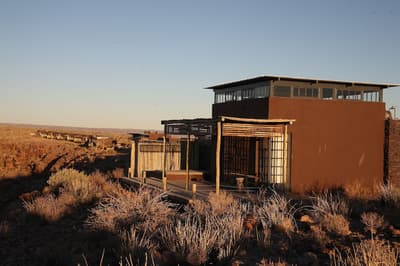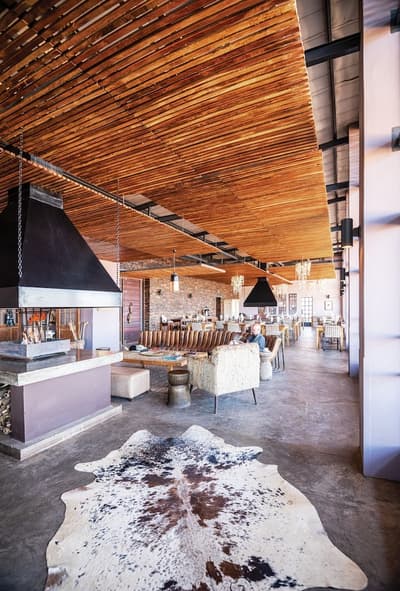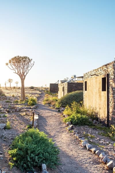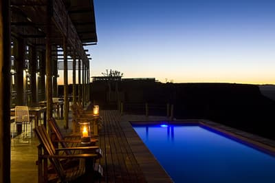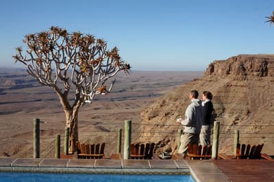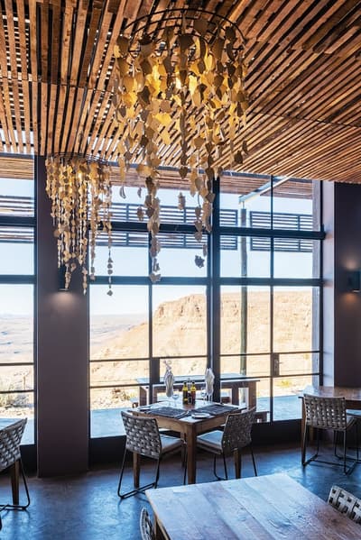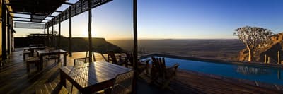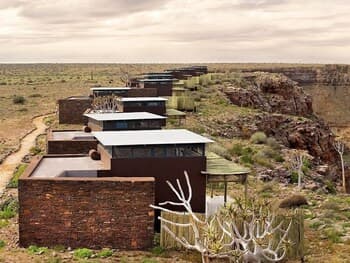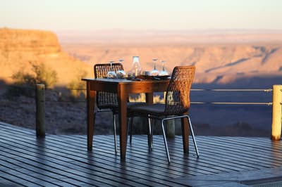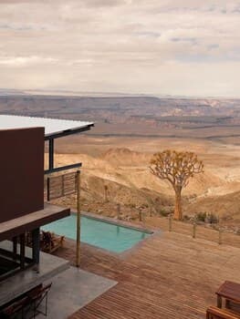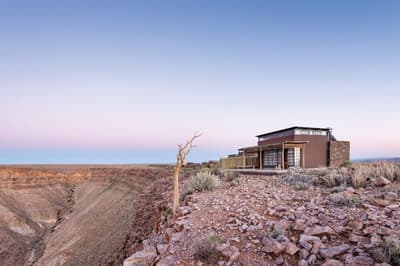 Imaginez-vous au bord du second plus grand canyon au monde... Oui ! Juste là... à contempler cette vue imprenable du lever au coucher du soleil. Vous vous y voyez ? Fish River Lodge l’a fait ! Rajoutez-y des chalets privatifs avec douche intérieure et extérieure, une architecture moderne, un personnel attentif. Vous y êtes... en communion profonde avec la nature, vu que le wifi est lent et payant ! On vient ici pour le côté unique et sauvage du lieu. Il faut être curieux, prêt à être suspendu dans le temps, avec une merveille géologique vieille de 500 millions d’années. Qui a dit que les vieux étaient dépassés ?! On l’observe à travers d’immenses baies vitrées quand le vent se lève. On profite de la piscine lorsqu’elle n’est pas trop fraiche. On se laisse glisser au cœur du Fish River Canyon grâce à la balade en 4x4 ou on opte pour le côté plus sportif et écolo à pied ou à vélo, d’Avril à Septembre. Leur slogan « au bord de l’éternité » évoque une pause bien méritée, fidèle au privilège rare qui s’offre dans un lieu si isolé. Loin de tout mais en paix des distractions de ce monde, on aura le temps d’observer son environnement ! Qui sait, vous pourriez bien croiser un des rares zèbres de Hartman sur la route non goudronnée, menant à l’Ouest du canyon... Ici les rencontres se font privilégiées, au gré du soleil. Les fenêtres à claire-voie offrent une myriade d'étoiles la nuit, tandis que les cheminées crépitent dans le pavillon principal pour une déconnexion totale.