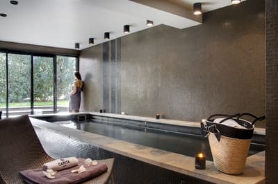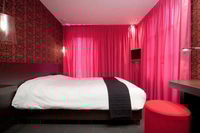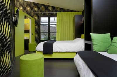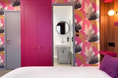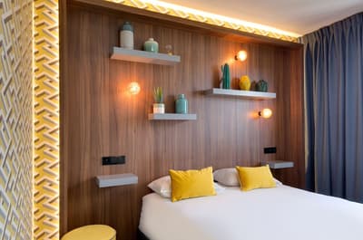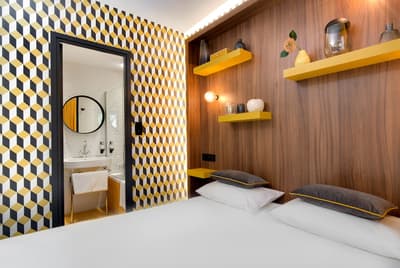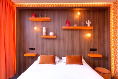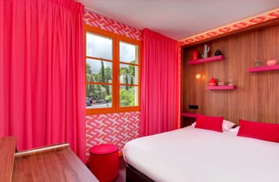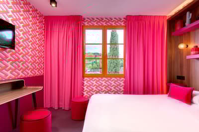 L’hôtel Montmorency, c'est un peu un "deux en un"... Ce 3 étoiles profite des prestations du 4 étoiles voisin, L’Hôtel du Château ! Tous deux sont la propriété des Rives. De rachats en (très) gros travaux, la famille a créé un complexe hôtelier sur un emplacement de rêve : devant l’entrée principale de la cité de Carcassonne ! Classé à l’Unesco, le site historique et fortifié draine près de 2 millions de visiteurs par an... et vous ! Le Montmorency compte 30 chambres et suites. Ici, la déco est contemporaine et très acidulée. Ambiance bleutée, orangée, caramel ou qui tire carrément sur le rouge… Murs, papier peint, faïence, sièges et rideaux s’agencent en un bouquet de couleurs punchy. Prêts à illustrer vos prochaines stories ? Au choix, vous pourrez bénéficier de la vue sur le jardin, d’un balcon, voire d’un patio. Mais le vrai plus, c'est de pouvoir profiter de la grande piscine chauffée du 4 étoiles, de son jacuzzi extérieur (à 34°C, s’il vous plaît !) et de son spa. Sans oublier le bar lounge et sa terrasse panoramique qui donne juste sur les remparts de la cité.