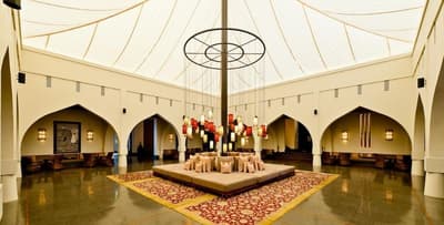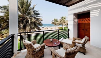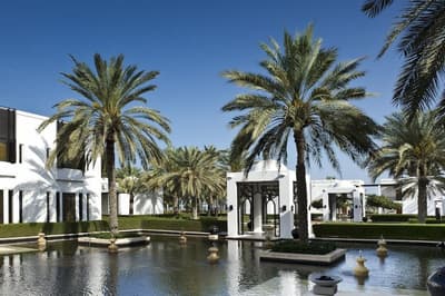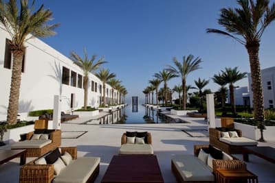 Amateurs de luxe épuré, cet hôtel est pour vous… Ce Chedi Muscat se distingue comme le premier hôtel contemporain sorti du sable d’Oman, en 2003 ! Attendez-vous à l’effet waouh quand vous découvrirez sa piscine au fond noir ultra-graphique, qui vous permettra de battre des records de vues sur votre compte Insta. Un autre bassin, long de 103 mètres, décroche, lui, le titre de plus grande piscine d’hôtel du Moyen-Orient. L’ensemble a été conçu par le « starchitecte » belge Jean-Michel Gathy, loin d’en être à son coup d’essai. Il a signé la plus grande piscine du monde, à 200 mètres de hauteur sur le toit d’un hôtel de Singapour... Sur les rives du golfe d’Oman, sobriété et design zen s’imposent comme les maître mots du Chedi, nom qui signifie coupole en arabe. Ainsi, dans un style minimaliste, les bâtiments blancs sont mis en valeur par des jardins aux lignes symétriques. L’hôtel donne directement sur la mer, avec l’avantage d’avoir sa plage privée de sable noir. Bon, c’est là aussi son point faible. Vous avez pied jusqu’à 500 mètres au large, avec vue sur une usine de désalinisation. Mais depuis les transats en teck au bord de la piscine, le panorama reste dingue sur les flots turquoise du Chedi, classé dans le top 15 des meilleurs hôtels du Moyen-Orient !
