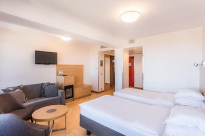 Encore plus spacieuse, elle est très agréable et confortable. Faite pour accueillir toute une famille, c’est le top ! Cette belle chambre accommode des lits jumeaux et dispose d’un canapé convertible. Salle de bain chic.