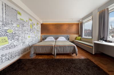 Vous souhaitez vous réveiller avec une vue hallucinante sur la ville de Tallinn, tout en étant à 500 mètres de la vieille ville ? L’énorme hôtel Original Sokos Hotel Viru est fait pour vous. Enorme, car on est clairement dans la démesure avec les 423 chambres installées dans cet immense gratte-ciel de 23 étages qui trône sur la ville. On n'est pas étonné d'apprendre que c’était un ancien QG des agents du KGB pour séjourner dans la capitale estonienne ! Rassurez-vous toutefois, l’hôtel a été rénové depuis les années 70, et il est même labellisé Green Key, avec pas mal d’engagements pour l’environnement à la clé. La déco, elle, n'est pas ouf, assez minimaliste et sobre, mais les chambres offrent une vue géniale sur la ville. C’est surtout le rooftop niché au 23e étage qui fait la force de cette adresse ! Sur place, en dehors du resto Tex-Mex, vous pourrez aussi vous asseoir à la table du bar dans le hall pour siroter une verre de vin, ou vous offrir une séance de sauna et un massage thaï. A savoir que l’hôtel est tout à fait adapté aux familles, avec des chambres conçues pour cela, équipées de lits superposés. Et si vous partez entre amis, sachez qu'une discothèque enflamme la night tous les week-ends ici !