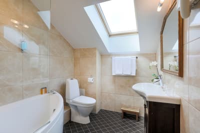 Spacieuse et lumineuse, elle profite d’une belle baignoire pour prendre des bains relaxants après une excursion d’une journée dans les rues de la ville. Elle dispose de tout le confort et d’équipements nécessaires pour des vacances agréables. La chambre peut accueillir un lit d’appoint et à noter qu'un lit bébé peut être fourni sur demande.