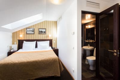 Elle bénéficie d’une décoration rustique et moderne avec un parquet en bois, un pan de mur en brique, un mobilier classique et se complète dans des tons neutres. La chambre est dotée d’un lit confortable et la salle de bains est équipée d’une douche ou bain à remous et de cosmétiques d'aromathérapie. Le tout dans une atmosphère cosy !