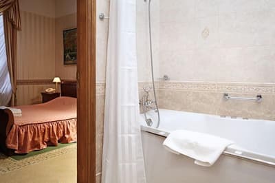 Encore plus spacieuse, elle est très confortable. Elle accommode des lits jumeaux et dispose d’un bureau dans un coin de la pièce. Salle de bain avec douche.